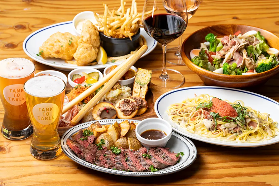 店内で醸造した自家製クラフトビールや、豊富な種類の自社直輸入ワインをご提供いたします。